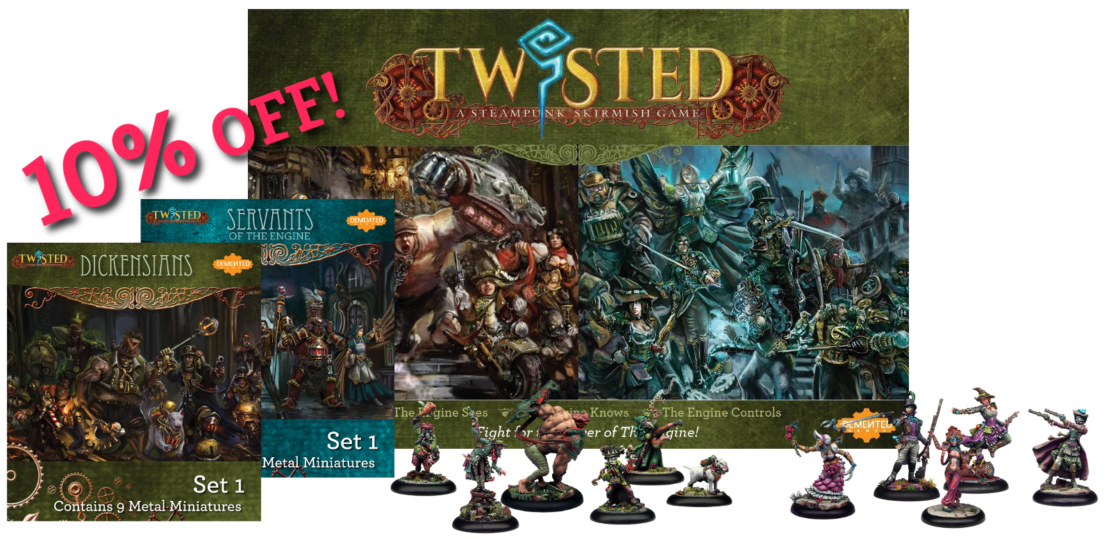 Includes the deluxe Rulebook Box Set, plus your choice of 2 Faction Boxes of metal miniatures. The perfect way to start playing Twisted!