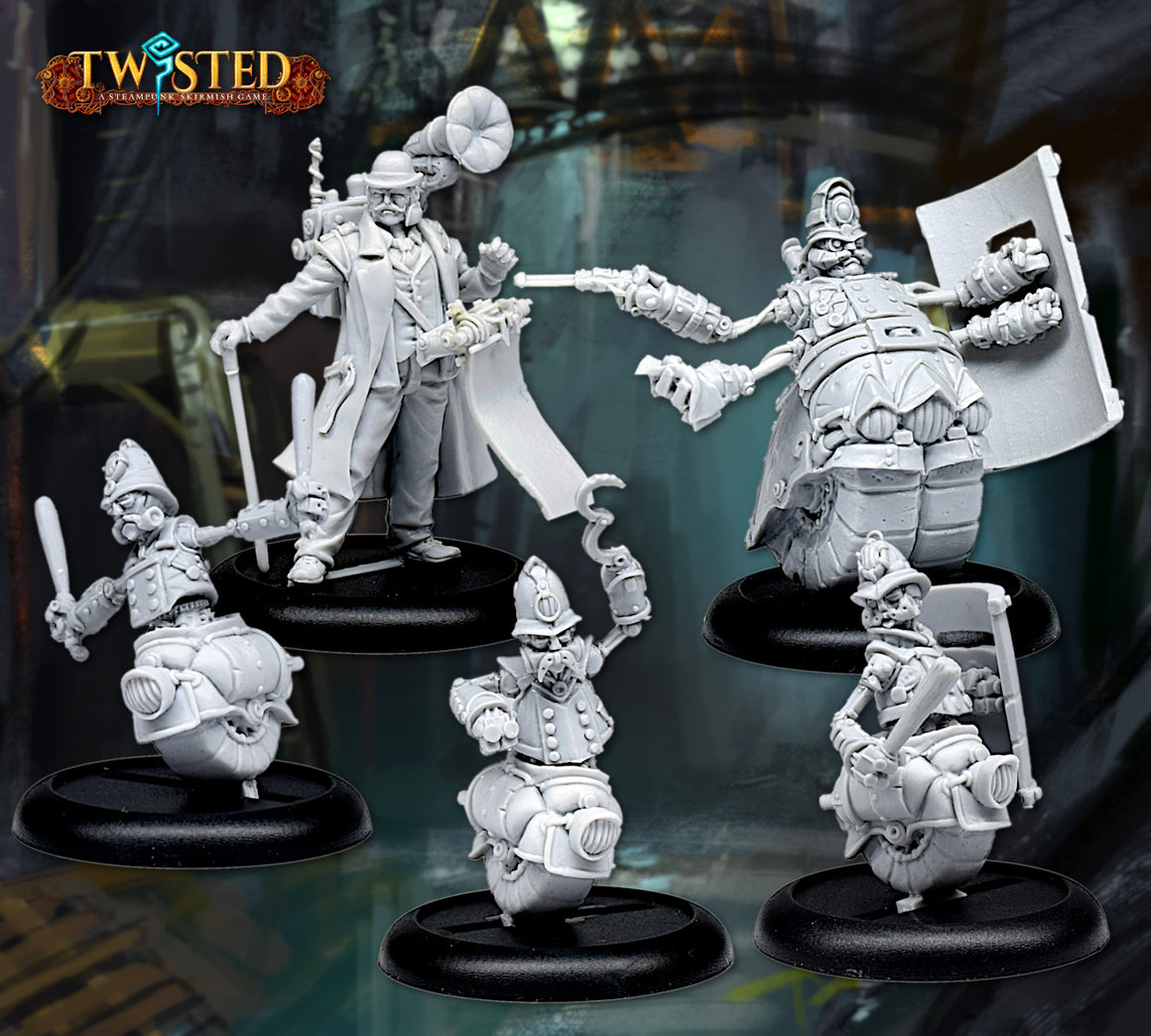 Chief Inspector Abberline leads the Clockwork Constabulary, directing orders to the mechanical Wheeled Bobbies through his loudspeaker.